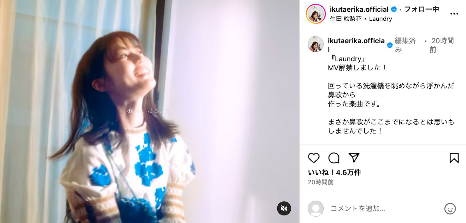生田さんは Instagram で、《回っている洗濯機を眺めながら浮かんだ鼻歌から作った楽曲です。まさか鼻歌がここまでになるとは思いもしませんでした!》と語っています。