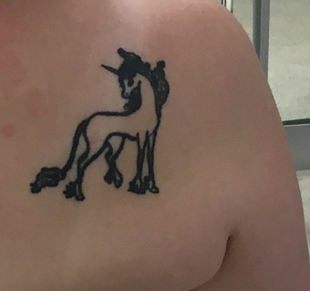 This is my favorite tattoo. I've wanted it since I was 13 and I'm 29. It's the unicorn from The Last Unicorn (book by Peter S. Beagle but also from the movie of the same title). I'm so proud of my Lady Amalthea. I also have on the other side of my back the moon and star from Daughters…Â